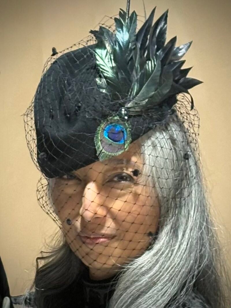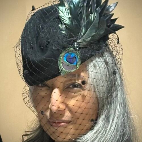 Luscious fur felt is hand shaped, lined in silk. Jet black (with an iridescent green value) coque and peacock feathers, and a crystal cabochon. Chenille dot cage veil. Custom colors and details are also possible. Because every detail matters: book now to design a hat that’s as unique as you are.