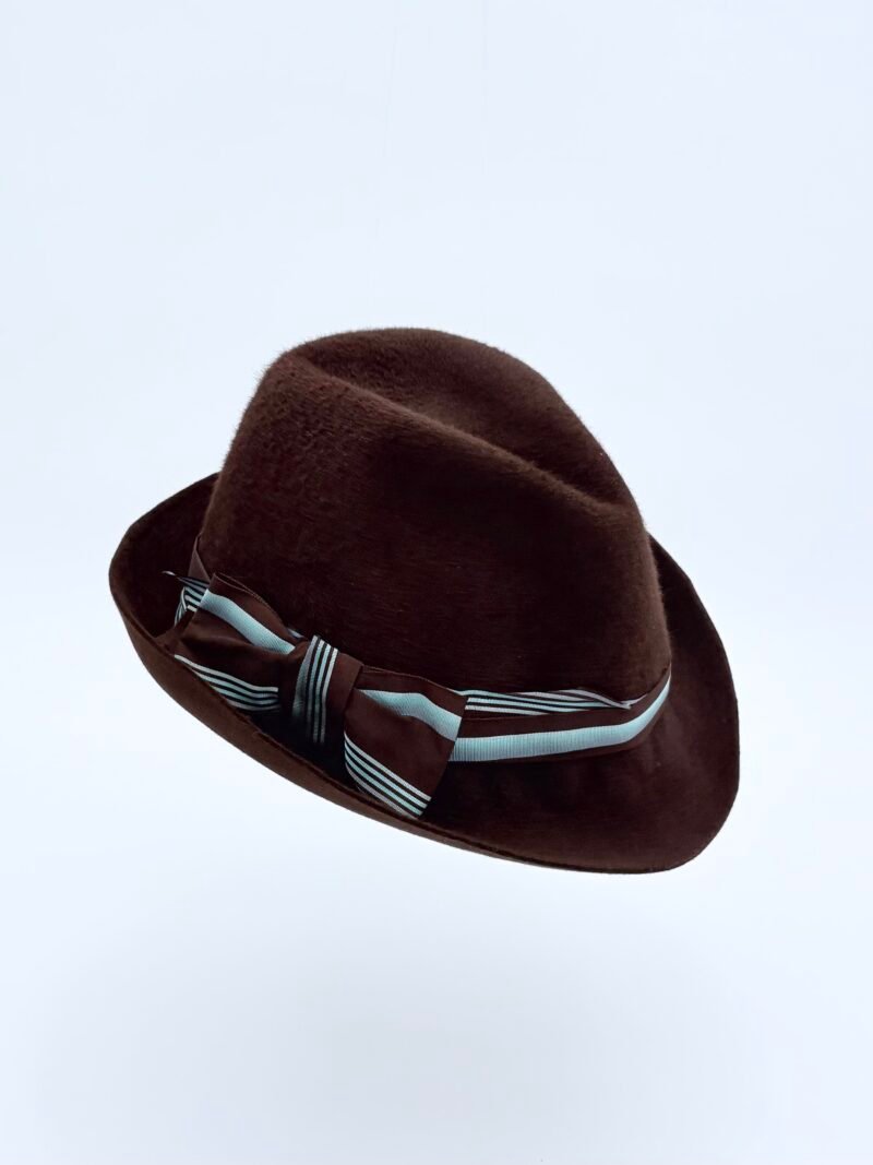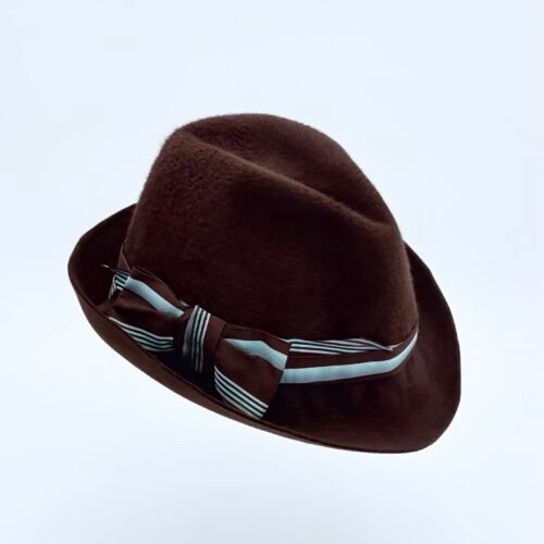A Playful twist on aclassic refinement. This chocolate “pony” trilby is finished with a striped taffeta bow, balancing heritage charm with a fresh, modern spirit. A statement of individuality, handmade for those who appreciate the finer details. PS our Lugano was made to travel! It folds up nicely and comes back to shape in a pinch. Pop it in your jacket pocket, or your bag. Have hat, will travel is our motto!