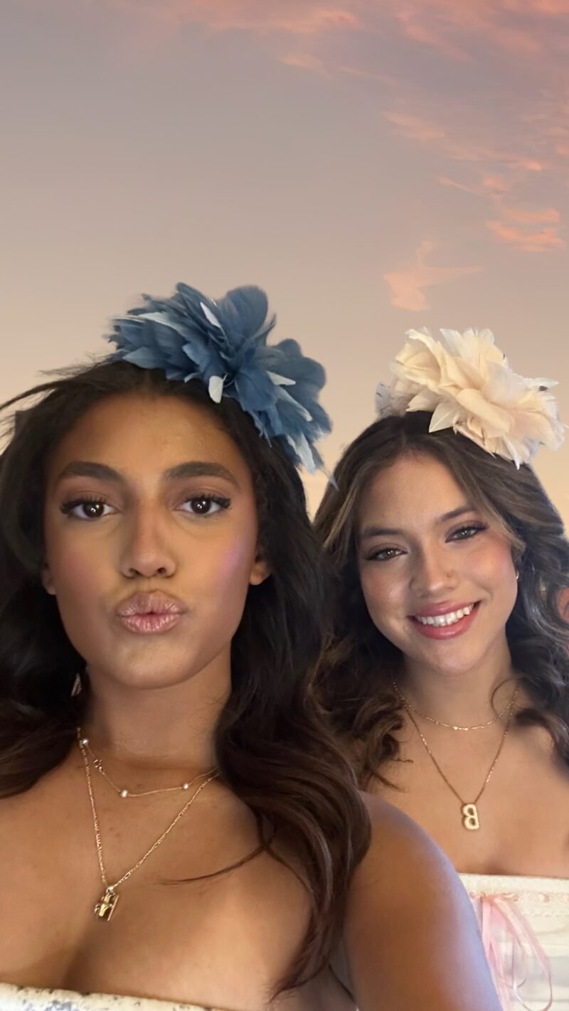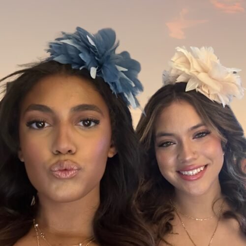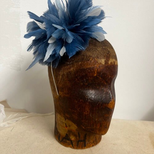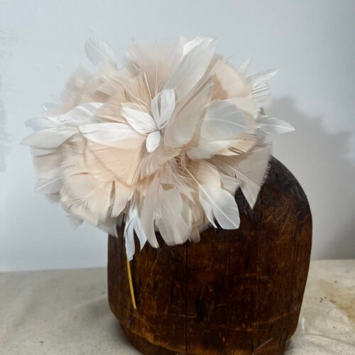Turkey, rooster and duck feathers combined in a bicolor powder puff fascinator on a metal headband.
