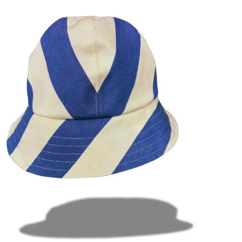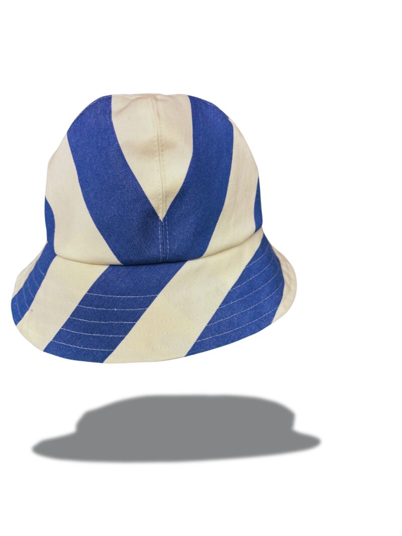 Cotton canvas in 1 1/2” stripes of blue and white or pink and white, with a 6cm (2.5″) brim. All of our hats are made by hand, cut individually and sewn in the USA, in the NJ and NY area. We use the most beautiful fabric, mostly US or European made (except the occasional Japanese denim or brocade).
