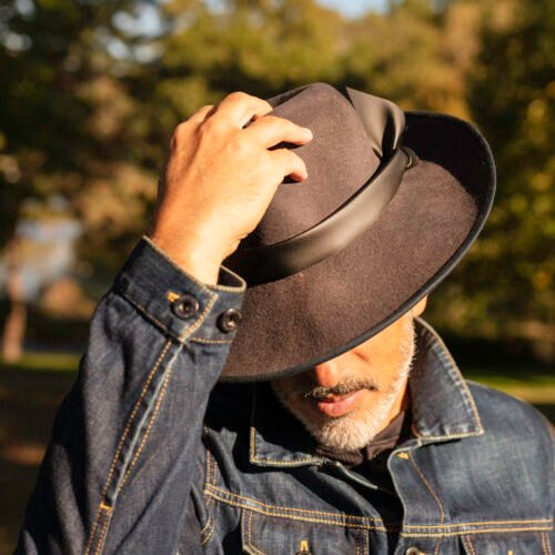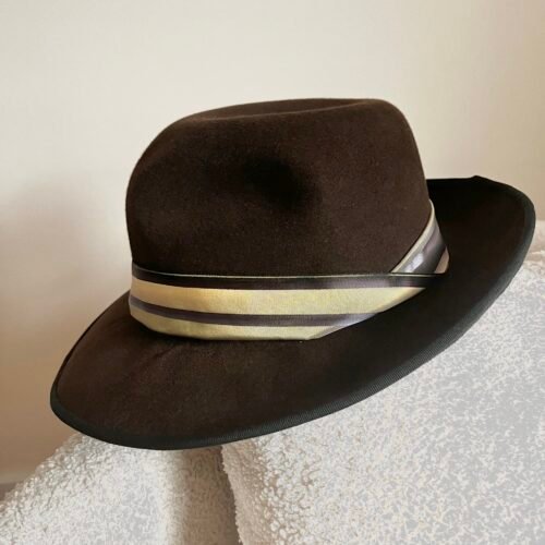 striped band in muted tones. Wired brim edge is finished with a narrow, tonal gros grain ribbon. Designed for the discerning client who appreciates heritage craftsmanship, it carries effortless sophistication from city streets to country escapes. Named for Brat Pack icon, and dapper dancer Mr Sammy Davis, Jr. We hope he’d love it.
