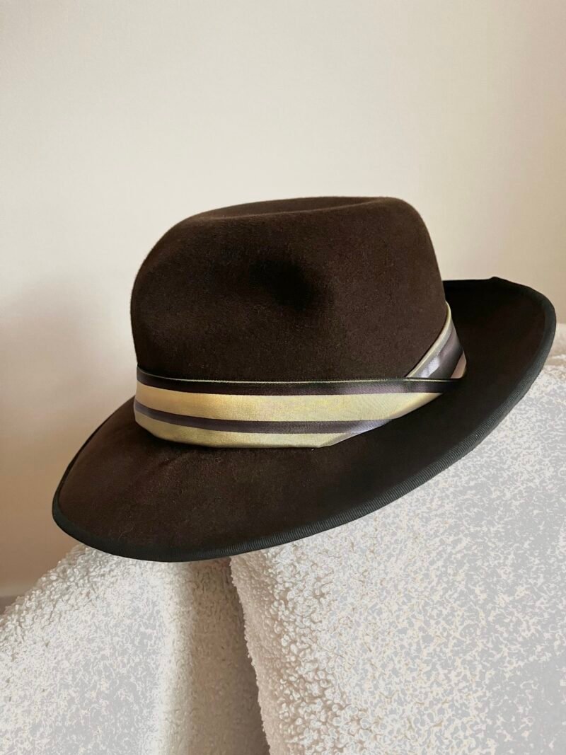 Suede felt is hand blocked and hand shaped into the perfect fedora with a 3″ brim. We painstakingly shape the brim with our iron egg for the perfect turn up and tilt. Wire is hand sewn to the brim edge and tonal gros grain is hand sewn to cover and finish the edge with a polished, sleek look. We line our cool weather hats in silk for comfort and to protect your hair. Custom colors and felt variations are available upon request, and prices vary. Book your appointment with us today, we can’t wait to make something beautiful just for you.